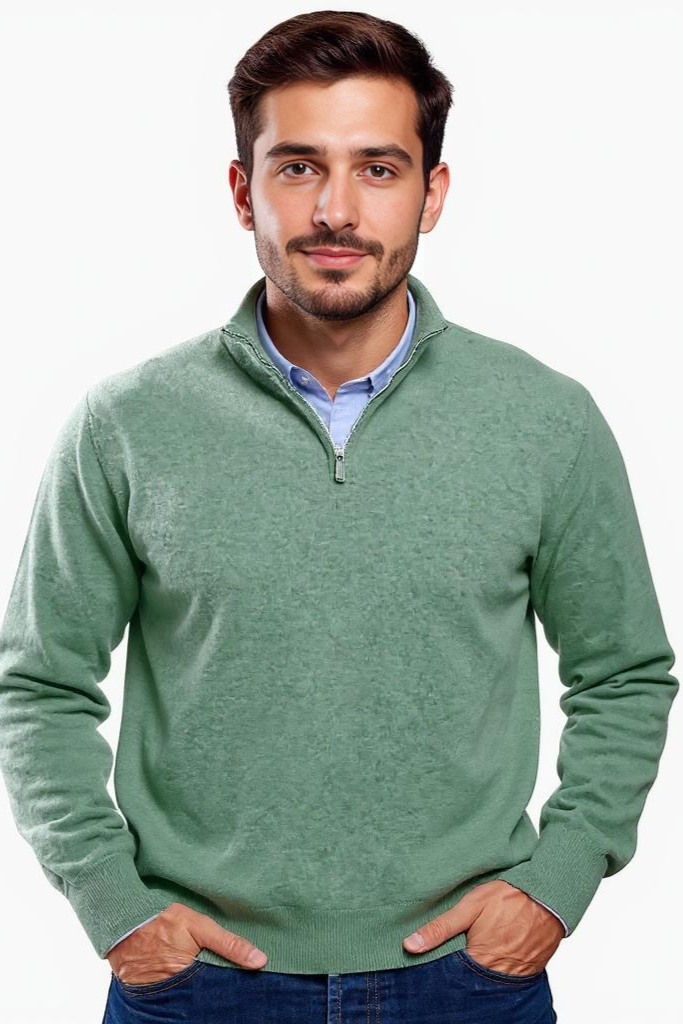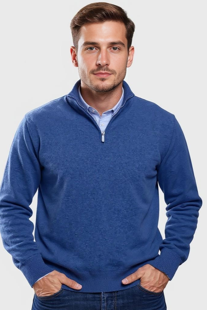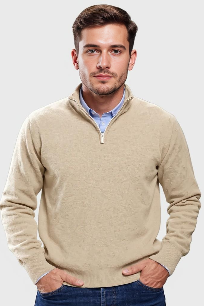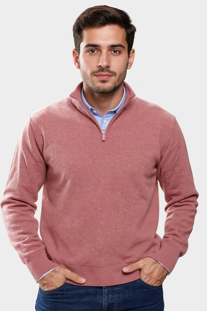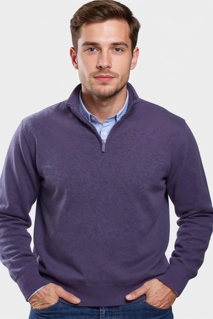 En klassisk trøje med høj krave og halv lynlås, fremstillet i let, struktureret strik. Perfekt til hverdage med skiftende vejr, nem at bruge alene eller som lag.